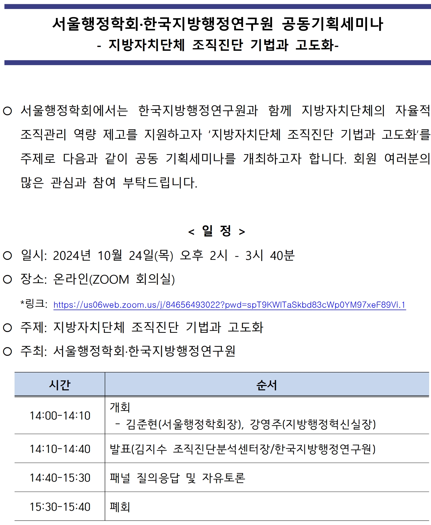 한국지방행정연구원·서울행정학회 공동기획세미나 개최 안내