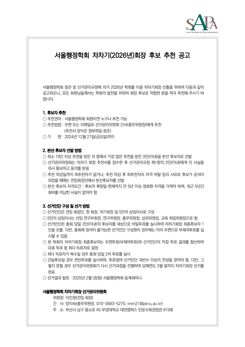 서울행정학회 차차기(2026년) 회장 후보 추천 공고